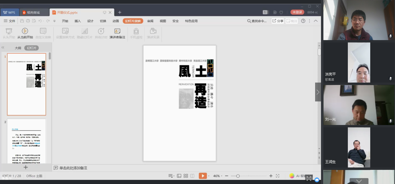 今年的联合毕业设计由昆明理工大学负责组织,昆明理工大学建筑与城市规划学院副院长杨毅教授作了热情洋溢的开题致辞,介绍了云南、腾冲的地域特色及乡村特点。随后,西安建筑科技大学段德罡教授、华中科技大学洪亮平教授以及我们王润生教授作为各校教师代表发言致辞,老师们表达了对本次联合毕业设计题目的见解与意见,并向武汉的老师同学们致以诚挚的关心问候。接下来由四校学生代表对各校参与的团队成员进行介绍,我们由郭清雅同学作为学生代表发言,同时表达了对本次联合毕业设计活动的期待。
