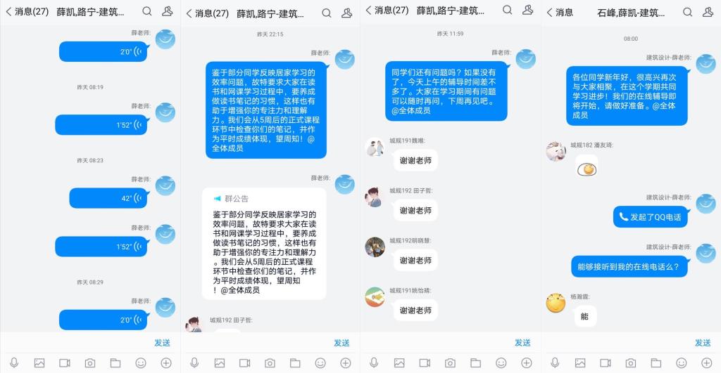 精心谋划,亦教亦学,保证线上授课质量。按照学校的有关要求和延迟开学期间学生的学习需求,城乡规划专业老师不等不靠,主动调整课程设计,积极利用技术条件,认真开展网络课平台培训,及时向师生公布网络教学方案,明确教学要求、学习方式和考核任务等。以QQ群、腾讯会议、雨课堂等多种沟通工具,建立涵盖各年级所有同学的网络联系群,组织开展线上学习,共开通网络专业课程十余门,实现网络教学全覆盖。课堂期间,老师们通过直播或者录播模式进行在线授课和远程辅导,学生们在家中积极配合,严格遵守制度,预习、课堂学习、回顾复习有条不紊,在学习群中师生形成良好互动。