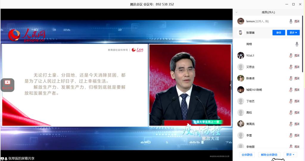 为确保本次思政课的有效开展,学院分团委、学生会、研究生会全体团学骨干在党总支副书记高江,学工办主任、分团委书记王鹏飞,辅导员李岩、刘超、杨霈宣、王明慧、郭轶群的带领下以腾讯会议的方式集体观看思政课;各班级由班主任牵头、班长组织,以线上专题班会的形式开展线上学习讨论;以宿舍为单位由舍长牵头大家广泛开展热议、发表学习感受,进一步强化对思政课讲授内容的理解。