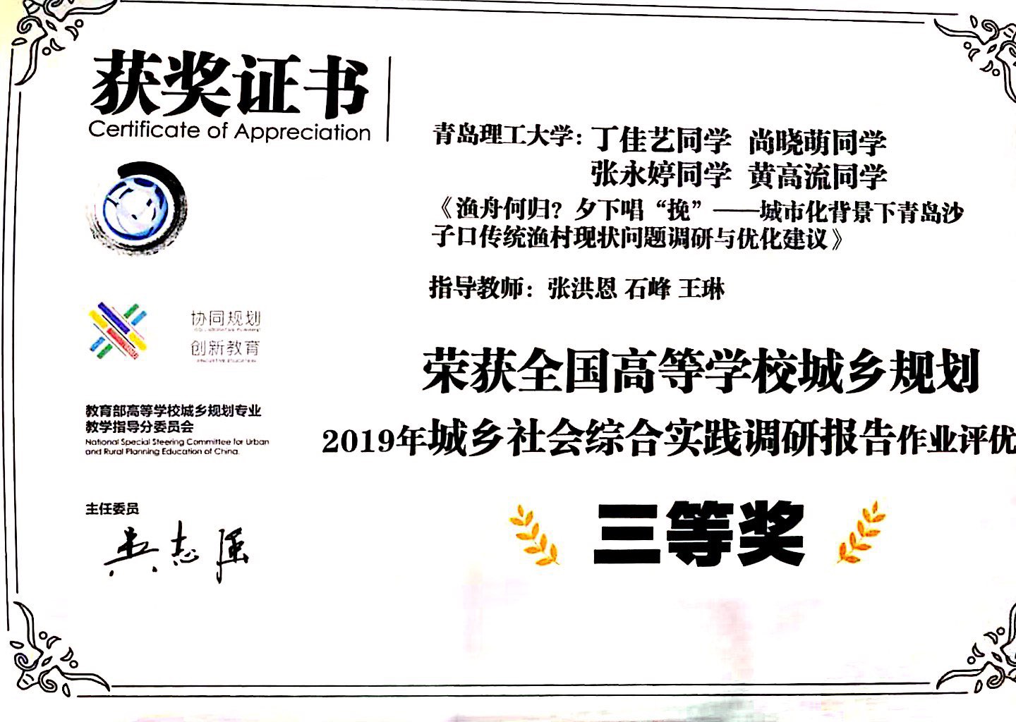 在“城乡社会综合实践调研报告课程作业”中,学院本科四年级学生丁佳艺、尚晓萌、张永婷、黄高流的作品《渔舟何归?夕下唱“挽”——城市化背景下青岛沙子口传统渔村现状问题调研与优化建议 》(指导老师:张洪恩、石峰 、王琳)的作品获得三等奖。该作品以青岛市滨海传统沙子口渔村为研究对象,调查沙子口渔村“三生”空间,解析城市化过程中渔村出现的空间冲突问题,从社会、经济、文化、管理等角度探究其内在成因,通过结合渔民和城市居民对于渔村未来发展需求与意愿,最后提出既能满足当地渔民生产生活需求,又能支撑传统渔村可持续发展的优化和更新策略。