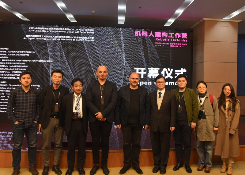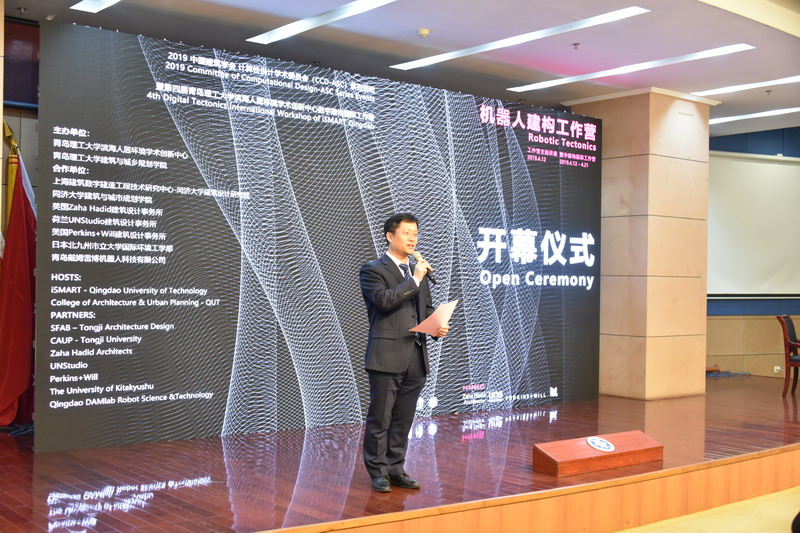 4月12日下午,由我们滨海人居学术创新中心、402cc永利官网联合主办、青岛沿海建筑设计有限公司支持的2019第四届机器人建构国际工作营开幕式在市北校区学术报告厅举行。