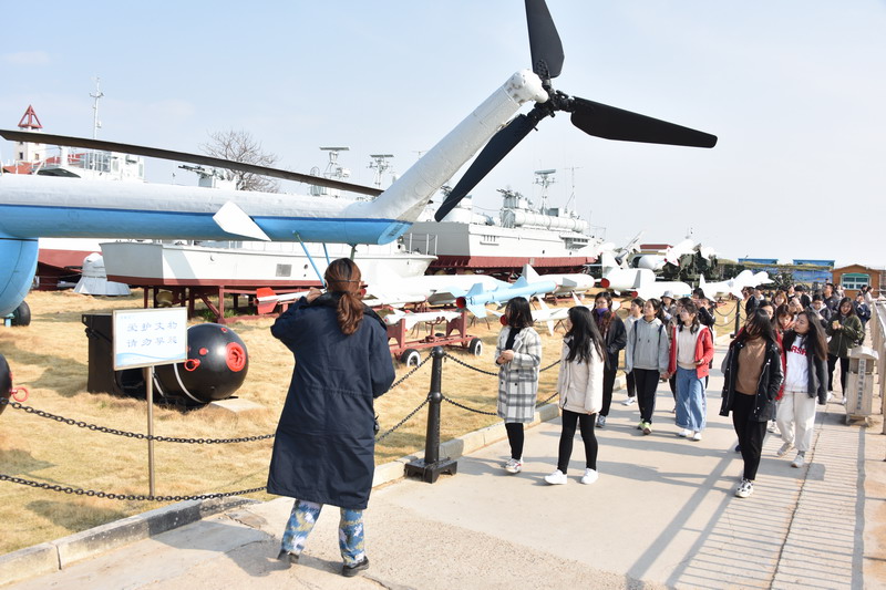 在海军博物馆武器装备展区,场馆解说员向同学们详细介绍了小型舰艇、飞机、导弹、火炮、水中兵器、观通设备、水中坦克等陈列武器的性能、作用及完成历史使命。同学们聚精会神地听解说员讲解并提出了自己的问题,积极地与解说员互动,就是在这样不断交流的过程中,同学们参观了退役军舰的实况,领略了中国海军的无限魅力。随后,在爱国情怀的召唤下,同学们又自行组织登上了驱逐舰以及导弹护卫舰,在舰船上瞭望海洋,切身体会并深入认识了人民海军的战斗历程和建设成就。参观结束,同学激动地表示:“虽然我们这次只参观了部分室外模型,但通过解读他们的历史,我们能清楚地感受到我们的我国海军正大踏步前进发展,并未自己的祖国感到骄傲!”