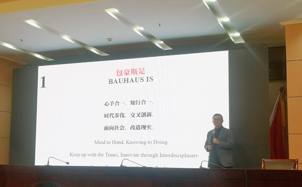 讲座开始之初,李振宇用诙谐的语言风格,在现场营造出了良好的交流氛围。他首先向同学们介绍了包豪斯的历史,为同学们深刻且新颖解读了包豪斯的定义。对包豪斯精神的解读中,李振宇提出了“心手合一,知行合一;时代步伐,交叉创新;面向社会,改造现实”的创新理解,并与当代建筑设计理念相结合,帮助同学们认识了“包豪斯”这一艺术风格。其次,李振宇介绍了包豪斯对同济大学教学楼及当代建筑大师风格的影响,用生动的例子着重强调了同济大学对于“包豪斯”风格交流传播所做出的贡献。