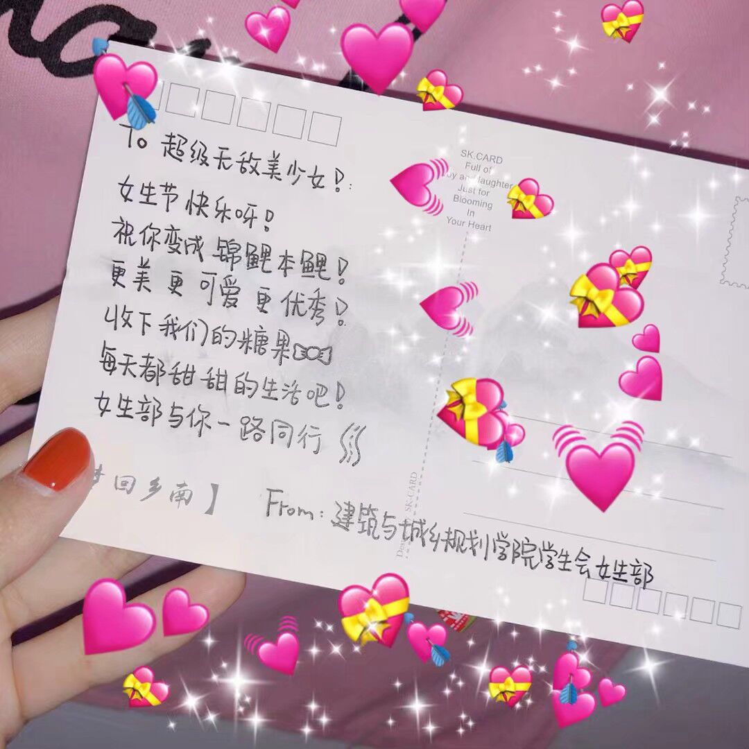 女生节的主旋律是一种人性关怀,旨在让女同学们在繁忙的学习生活中,收获一个笑脸、一份祝福、一份温暖。此次系列活动的首发站名为“幸运色心意随送”——以米白色和红色为幸运色,女生部同学们在食堂门口搜寻穿着幸运色的女生,送出贺卡和糖果。每一张贺卡都是心怀一份美好书写而成的,字里行间下,写尽对青春洋溢的女孩们最诚挚的祝福。系列活动不止于此,建馆三楼中庭的摆拍神器也引起了同学们的围观,展开了超乎预料的热烈互动。