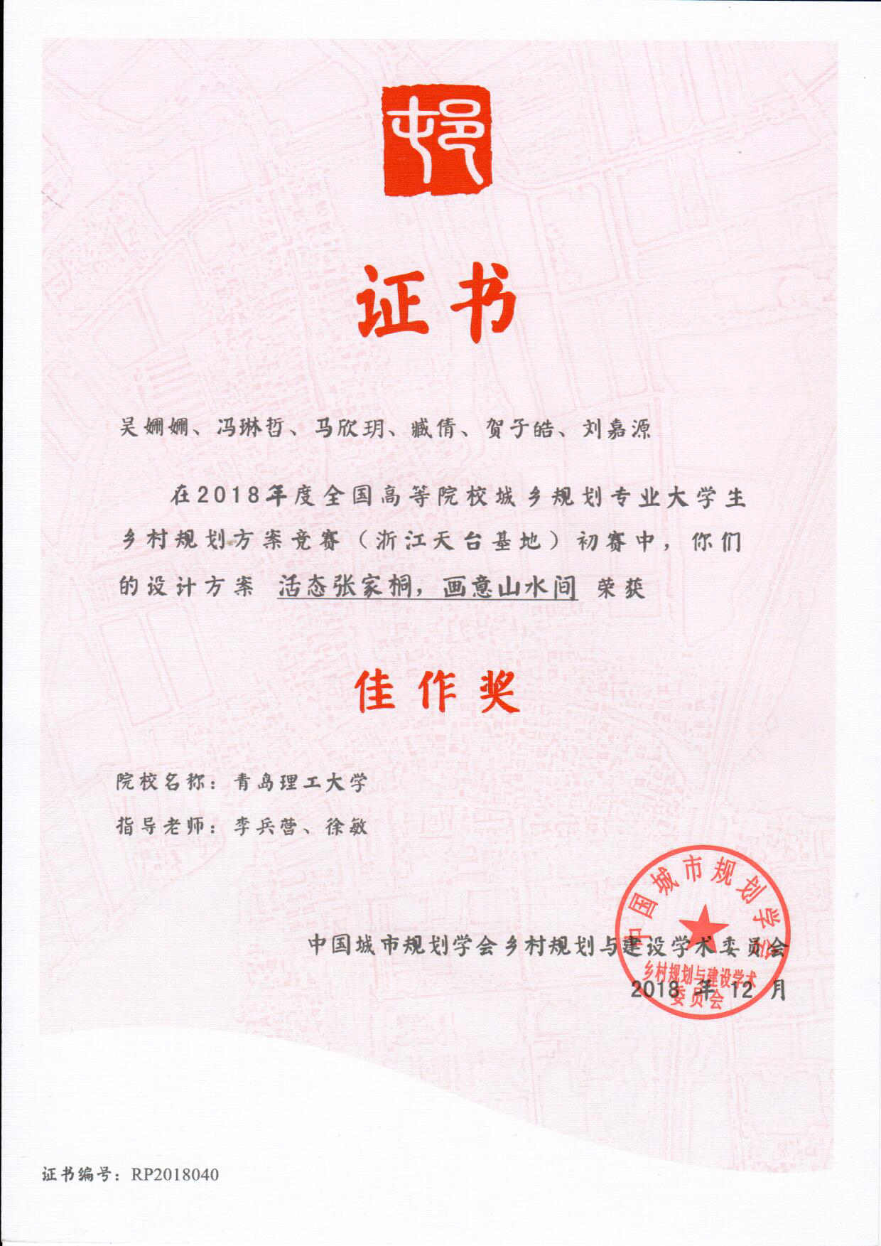日前,从2018年度乡村发展研讨会暨第二届届全国高等院校城乡规划专业大学生乡村规划竞赛方案评优会传来喜讯,我们402cc永利官网城乡规划专业本科四年级学生吴姗姗、冯琳哲、马欣玥、臧倩、贺子皓、刘嘉源(指导教师:李兵营、徐敏)的作品《活态张家桐,画意山水间》获得佳作奖。