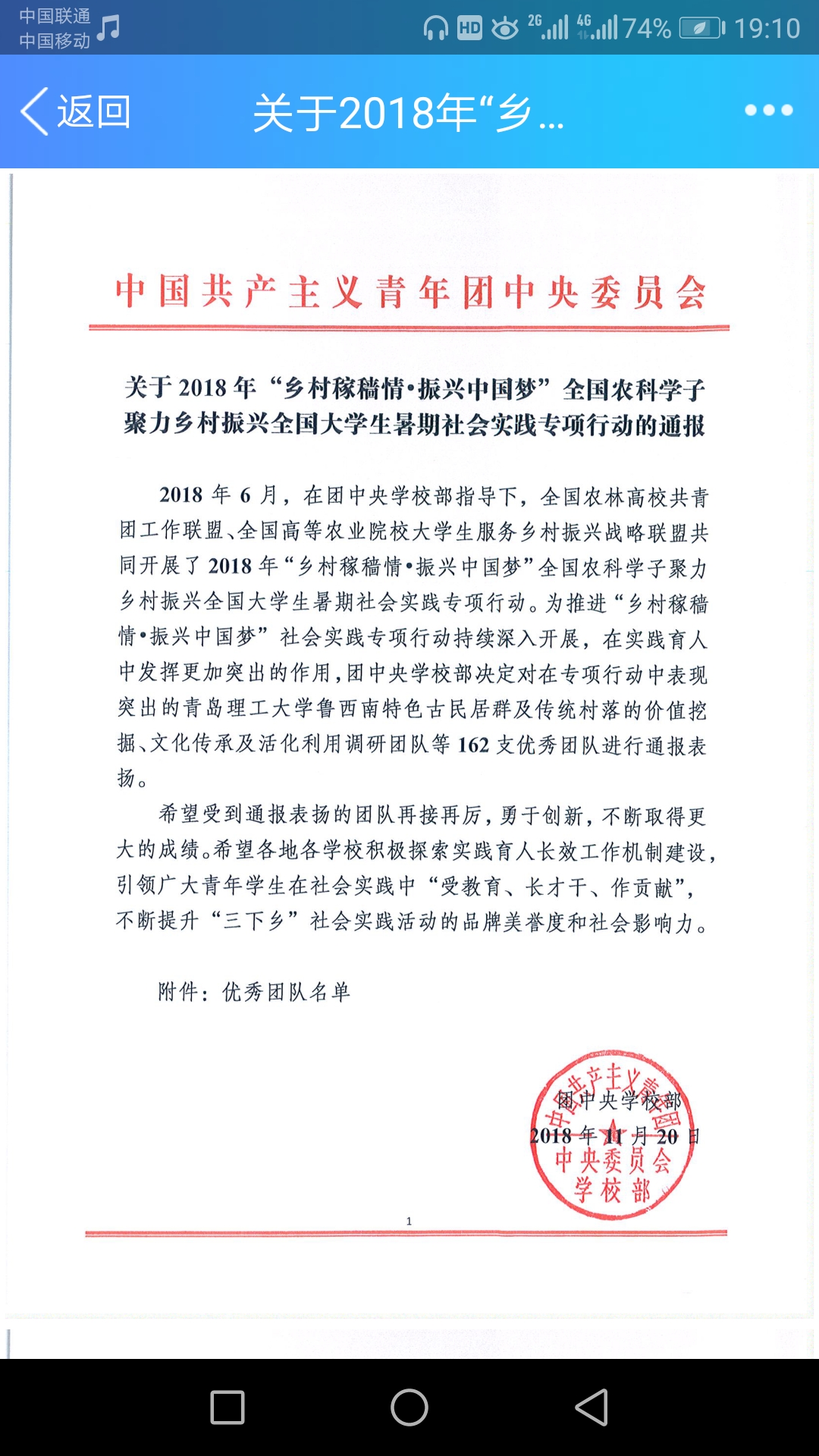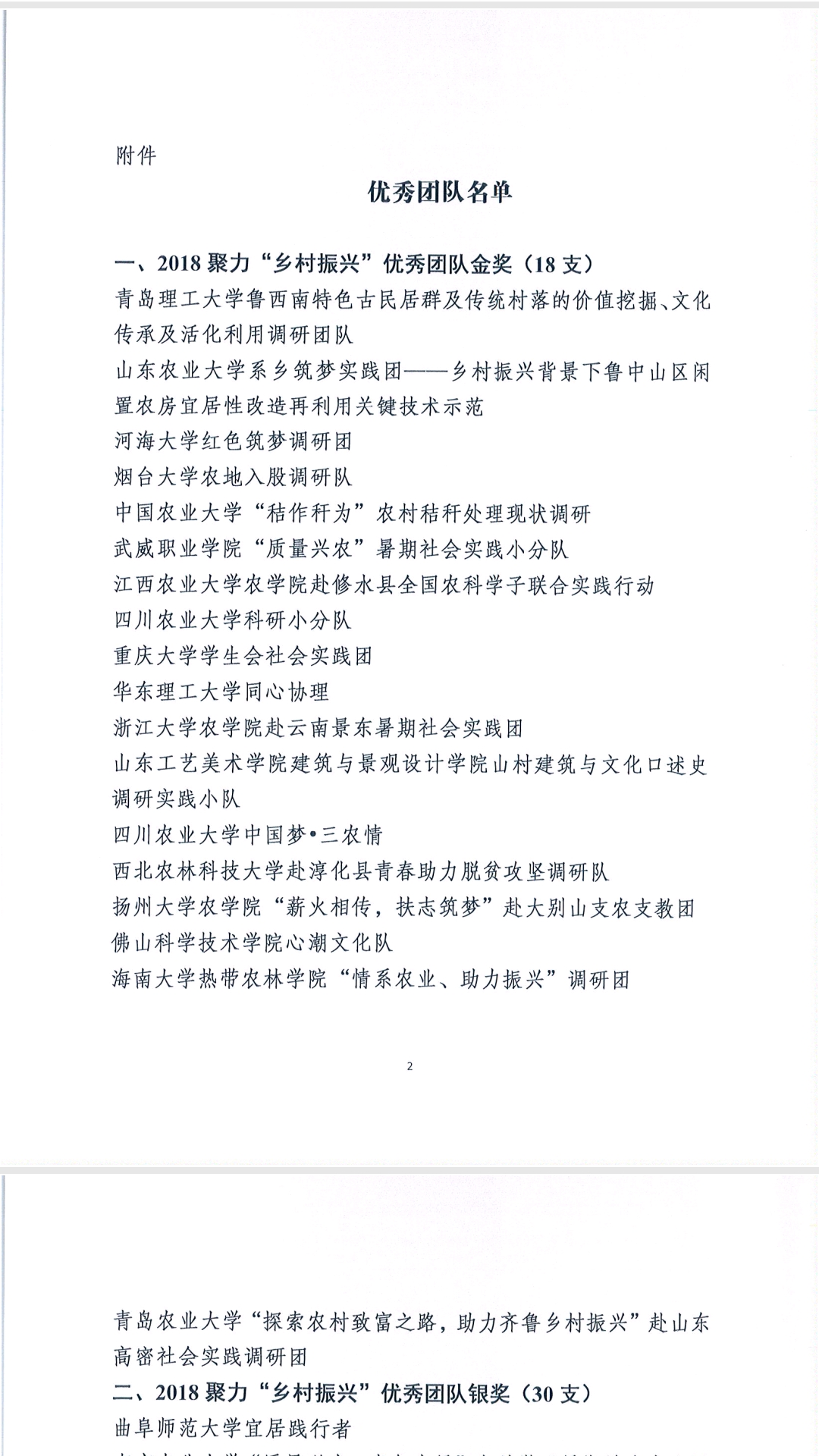 近日,由团中央学校部主办的2018年“乡村稼穑情·振兴中国梦”全国农科学子聚力乡村振兴全国大学生暑期社会实践专项行动评选结束,我们由402cc永利官网徐敏老师指导,城乡规划专业韩树娟、丁佳艺、吴姗姗、付梦姣等9名同学组成的鲁西南特色古民居群及传统村落的价值挖掘、文化传承及活化利用调研团队从全国162支团队中脱颖而出,荣获全国优秀团队金奖(第一名)。