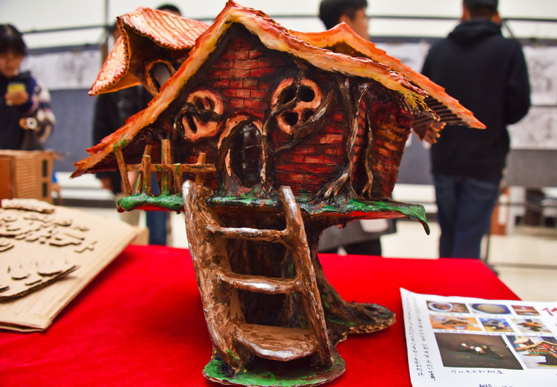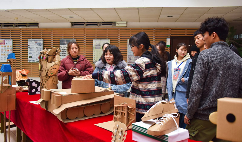 本次比赛要求以团队形式报名,每个团队两至三名选手,规定日期前利用纸箱进行裁剪、组合、粘接、上色创造出主题不限的作品。同学们的创意别具一格,今人耳目一新。有些同学创作灵感来源于生活。例如一组同学裁剪纸箱做成了一包薯片,纸箱的瓦楞结构正好贴合了薯片的形状,十分生动形象。有部分同学的创意来源于游戏、动漫或影视剧,如《纪念碑谷》中的游戏场景,动漫小机器人的卡通形象,热门电影《复仇者联盟3》的重要电影道具。还有小组对材料的使用方式进行了创新,并非利用纸箱板进行拼接,而是将纸箱撕碎再加入白胶以便于进行更加自由的创造,既保留了瓦楞纸的触感又不被纸箱较硬的形状所束缚。