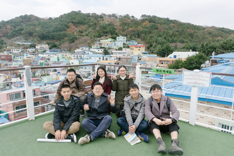学术汇报后,老师与同学们调研了位于釜山市内的甘川文化村。这片区域原是釜山代表性的贫民区,2009年进行了村落改造计划,遂变成了五颜六色的文化村。在这里,大家感受到了设计为村落带来的巨大改变,讨论改造对村落发展带来的影响,为下学期的旧城改造设计课提供了新的思路。