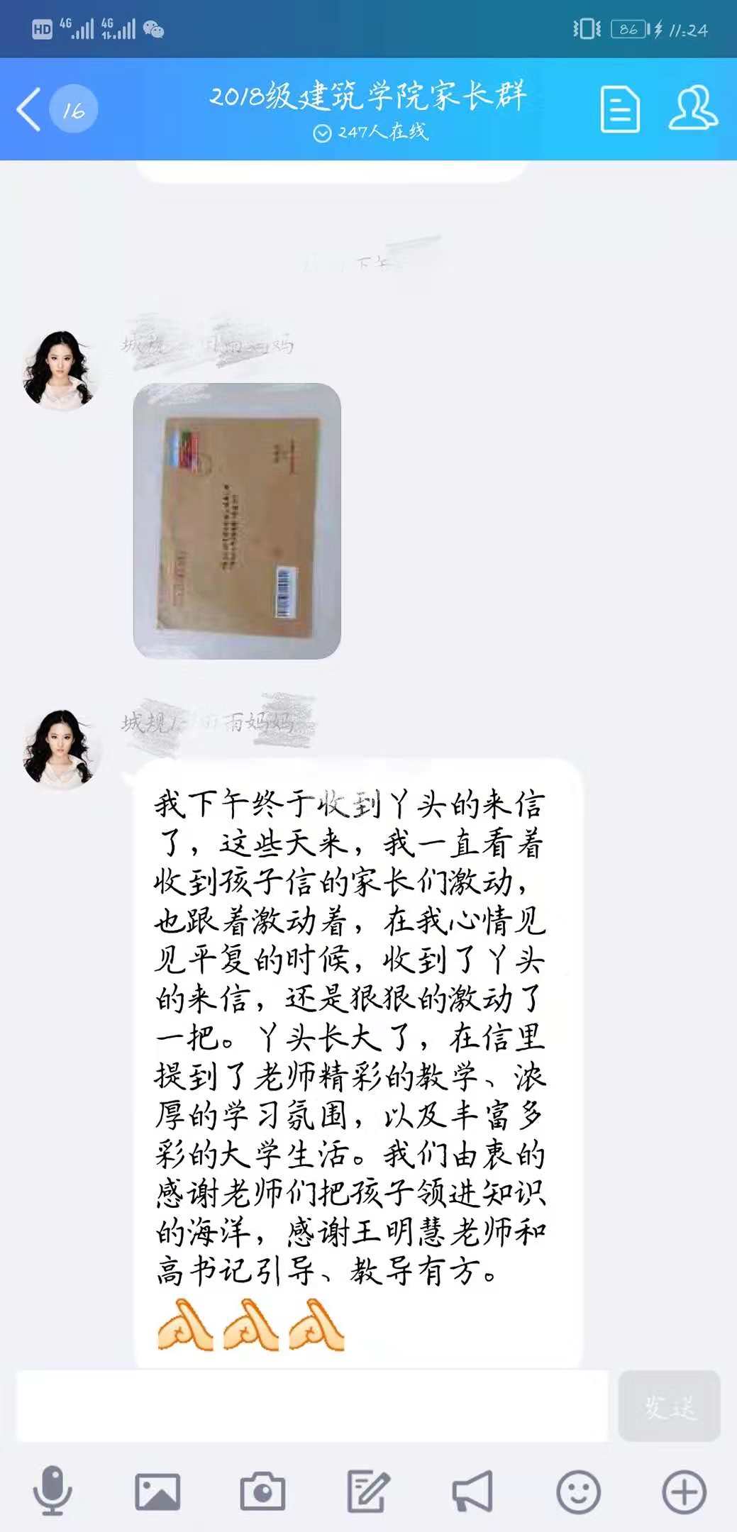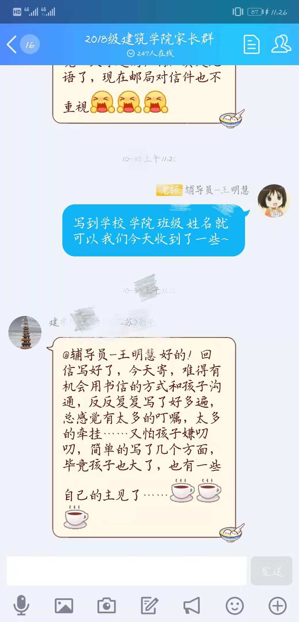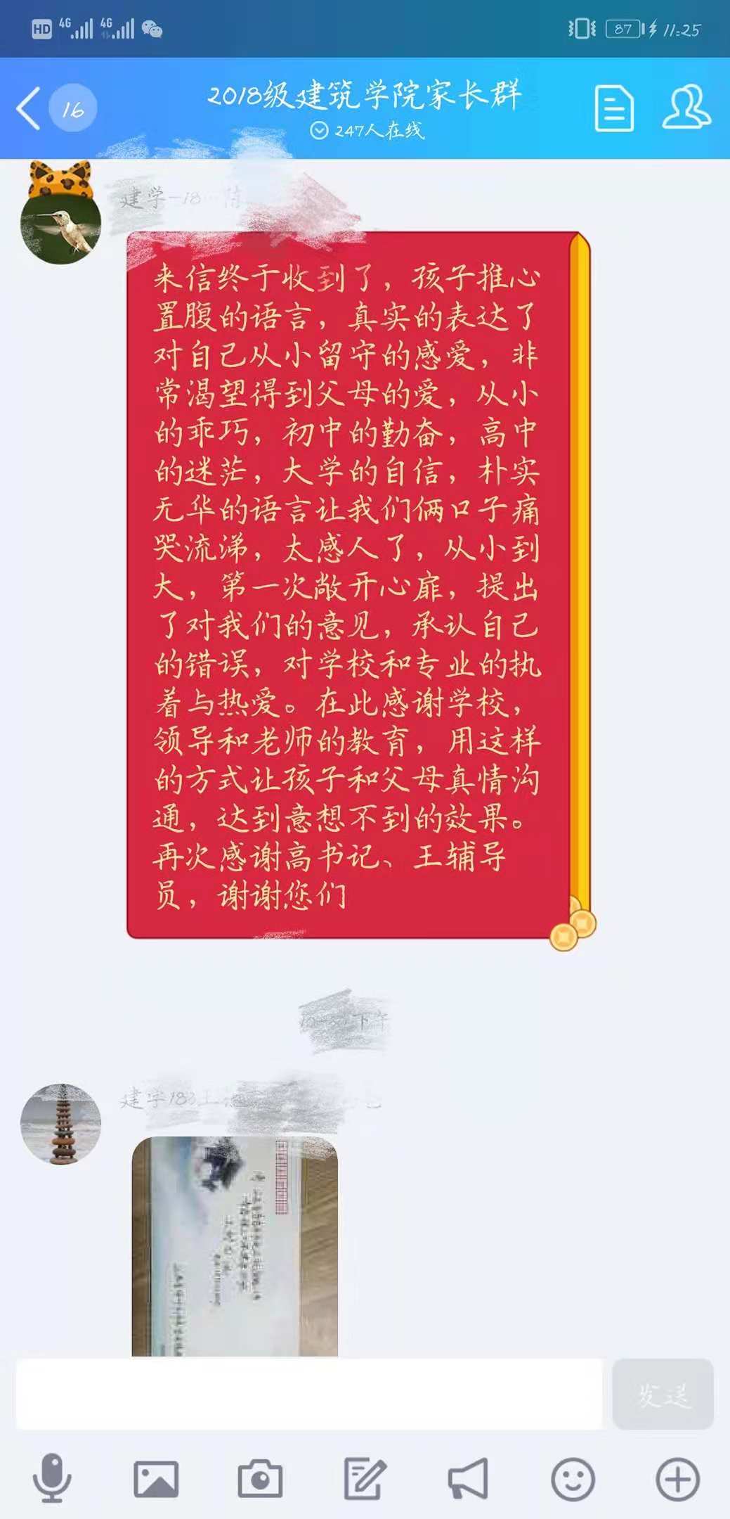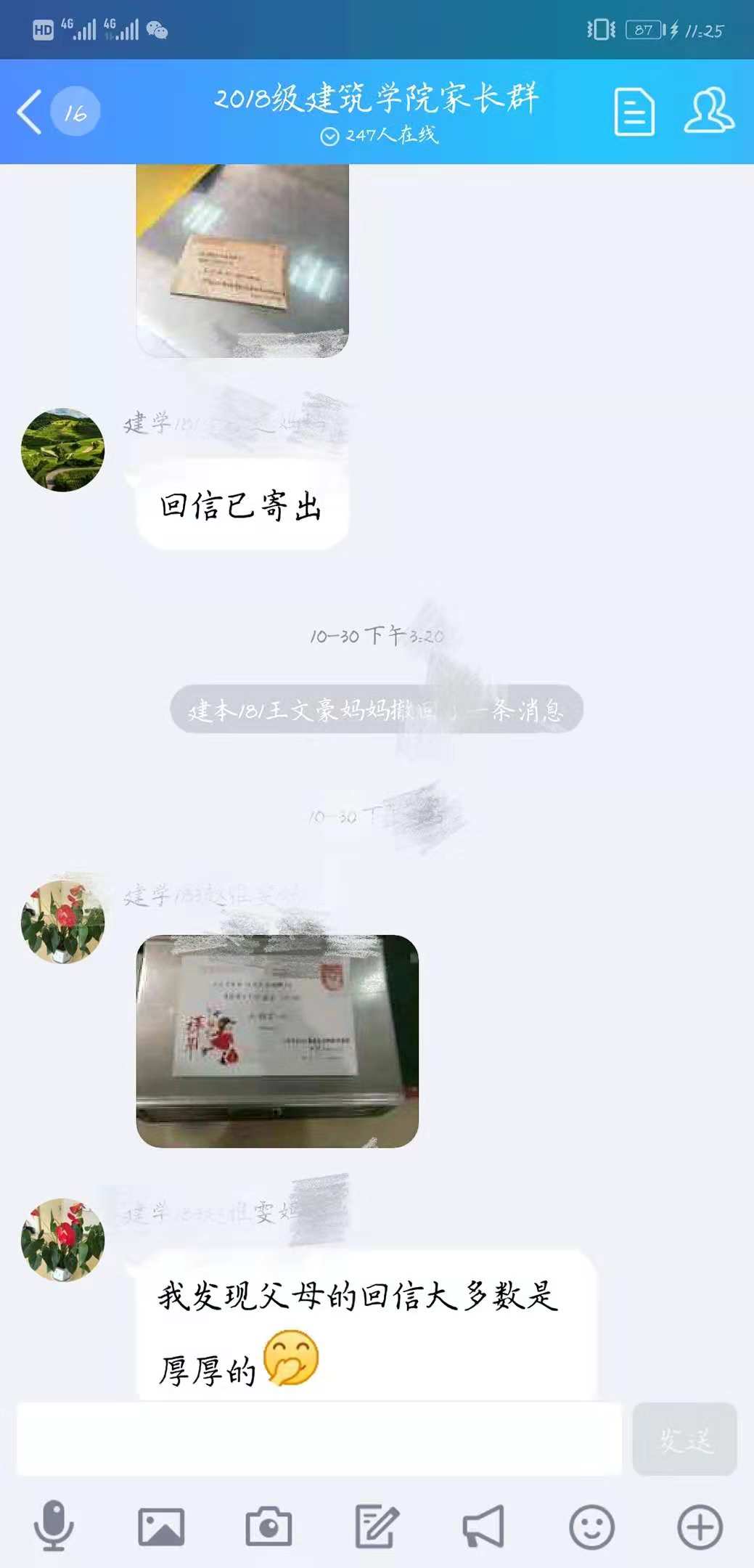 大部分家长从未收到过来自儿女的亲笔信,也从未和孩子相隔如此之远,在看到其用心写下的家书时,备受感动,迫不及待地将真情实感化为文字寄回,更是有身在国外的父母为曾留守17年的孩子写下长长的回信,邮件里的一沓信纸,承载着他们在异国无数个日夜间对孩子的愧疚与期望。希望当同学们展开回信,能够见字如面,能够将松懈的心重新收回,发自内心地产生“羔羊跪乳,乌鸦反哺”之情。
