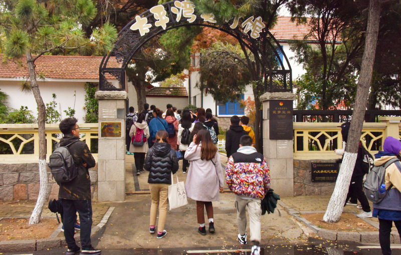 在参观完花石楼之后,旅行小队继续深入八大关,感受八大关的代表性建筑的独特之处。在八大关的落叶的陪伴下,同学们走进公主楼,对这栋丹麦式建筑的历史典故进行了详细的了解,惊叹之余也感受到了建筑之美。最后,旅行小队来到了景色优美的中山公园,在美丽的菊花展旁合影结束今天的旅行。