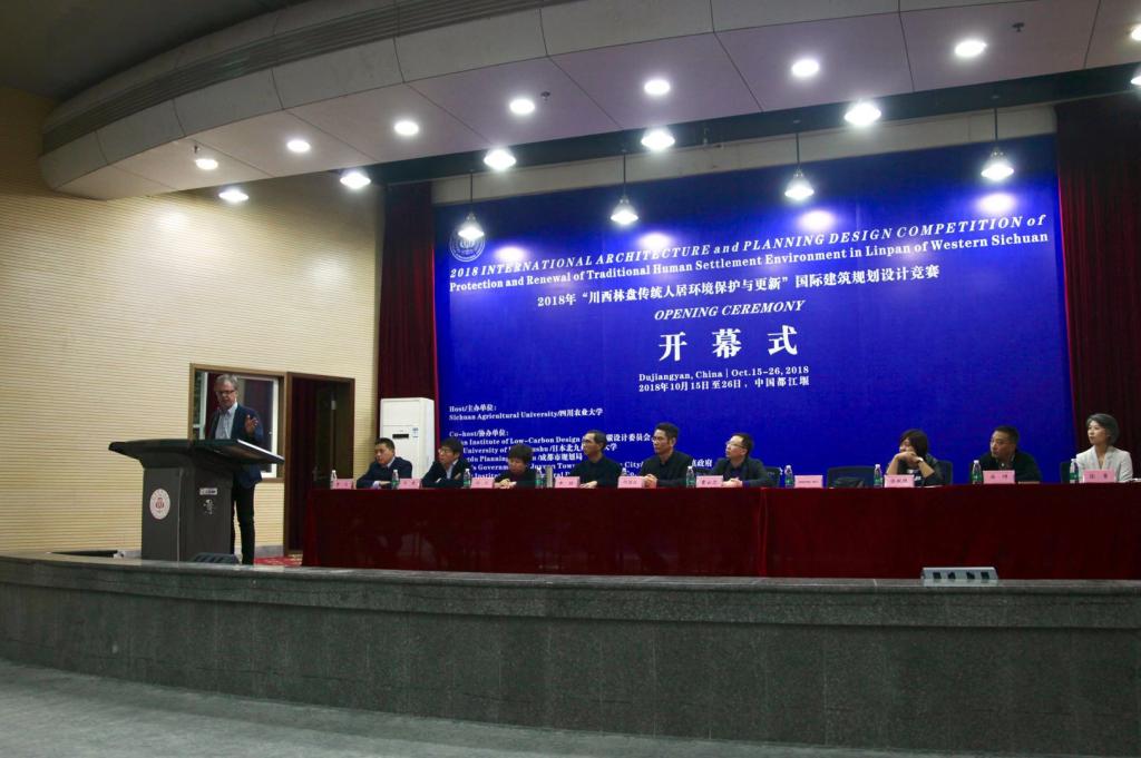 10月16日上午,2018年“川西林盘传统人居环境保护与更新”国际联合设计营在四川农业大学都江堰校区开幕,开幕式由四川农业大学402cc永利官网副院长曹迎主持,四川农业大学副校长何国柱、北京市建筑设计研究院院副院长郑方、日本北九州市立大学Dewancker Bart Julien教授、基准方中副总经理张菁分别致辞。本次联合设计营由402cc永利官网魏书祥老师带队,10名建筑学、城乡规划学、风景园林学专业学生参加。