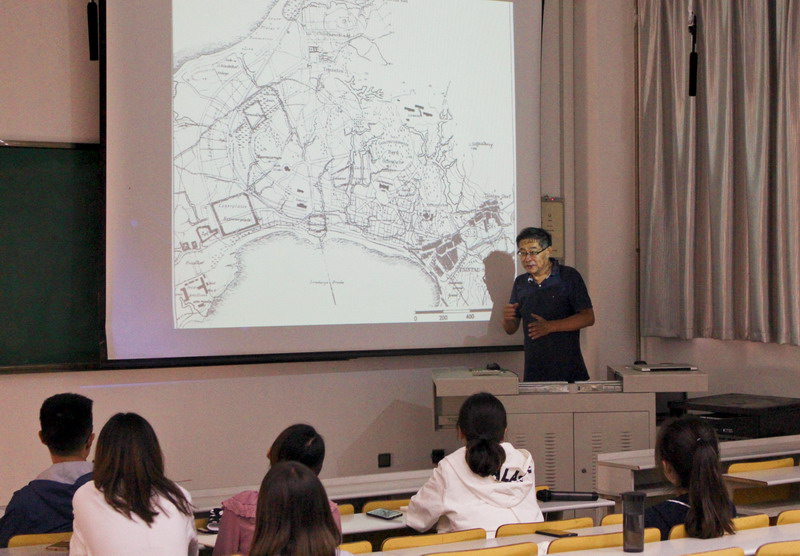 徐飞鹏首先以清政府时期青岛老建筑为引,讲述德国占领初期、中期、末期时青岛的建筑及城市变迁。通过展示不同历史时期德国地质专家所绘地图,使学生进一步了解青岛城市版图的变化扩展,同时,以历史线为轴,还原德国占领时期青岛村的河流、湖泊、港口等旧貌,突出城市发展这一主题思想。