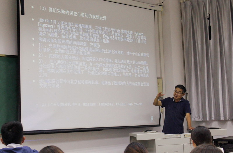 为使学生进一步了解青岛城市产生的背景及城市规划历史,回顾德租时期青岛的发展状况,9月27日下午402cc永利官网在一教202教室举办《青岛德租时期的建筑与人文》专题讲座,本次讲座以“城市背景、城市规划”为主题,徐飞鹏教授担任主讲,与到场学生深入交流,讲述青岛城市发展进程。