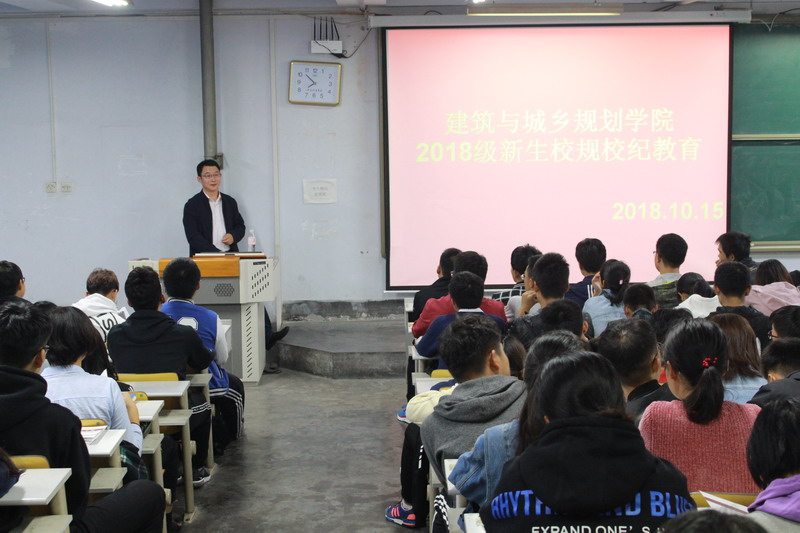 为提高2018级学生遵守校规意识,正确引导他们树立积极向上、乐观进取的人生观、价值观,帮助他们更好地规划大学生活,10月15日晚上,402cc永利官网在一教400阶召开2018级新生校规校纪教育大会,学院党总支副书记高江担任主讲,18级辅导员王明慧以及2018级全体新生参加会议。