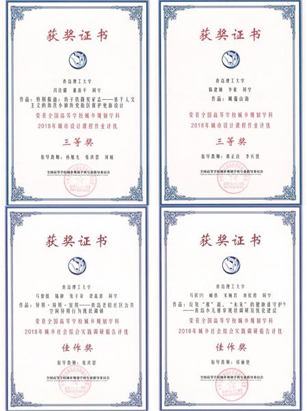 在“城市设计课程作业评优”中,我们本科五年级学生冯佳璐、董喜平作品《特别报道: 坊子铁路炭矿志一一基于人文主义的坊茨小镇历史街区保护更新设计》(指导老师:孙旭光、张洪恩、刘敏)和陈建颖、李豪的作品《城蕴山海》(指导老师:李兵营、蒋正良)获得三等奖。在“社会调研作业评优”中,我们本科四年级学生马欣玥、臧倩、宋婉君、刘欣霞的作品《 反复“推”敲,“未来”的健康谁守护?——青岛小儿推拿现状调研及优化建议》(指导老师:祁丽艳)和本科四年级学生马誉懿、陆静、张子奇、梁嘉慧的作品《异用·易用·宜用一一青岛老旧社区公共空间异用行为现状调研》(指导教师:张洪恩)获得佳作奖。