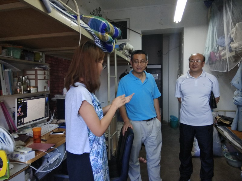 学院领导以及学生工作干部走访到每一个学生宿舍,详细了解学生返校情况,查看了新生宿舍基本情况。通过与学生深入细致的交谈,掌握了同学们的思想动态和生活状况;听取了同学们对学院各项工作的意见和建议,并提醒大家要注意宿舍通风,保持宿舍整洁的环境,注意人身和财产安全;鼓励同学们尽快调整状态,养成良好的生活习惯,以崭新的精神面貌迎接新学期的开始。在宏业毕业学生宿舍,肖学斌详细的询问了学生的就业、考研准备情况,并嘱咐同学们有就业困难要及时向辅导员、专业老师以及学院分管领导沟通汇报,以便更好地解决遇到的各种困难。在四公寓,许从宝询问了同学们的暑期生活状况,同时指出大家应该迅速调整自己的状态、心态,尽快融入到新学期的学习、工作和生活中。