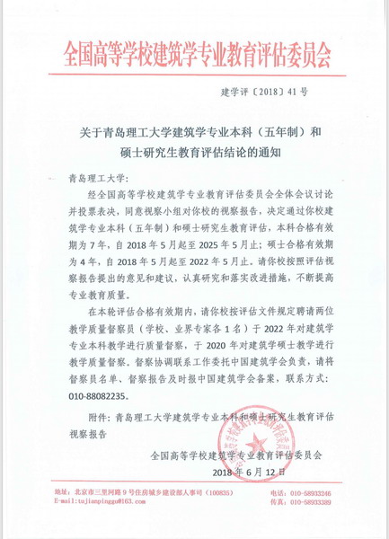 近日,全国高等学校建筑学专业教育评估委员会正式下文(建学评[2018]41号文件),经评估委员会全体会议讨论并投票表决,同意视察小组对我们的视察报告,决定通过我们建筑学专业本科(五年制)和硕士研究生教育评估,本科合格有效期为7年,自2018年5月起至2025年5月止;硕士合格有效期为4年,自2018年5月起至2022年5月止。