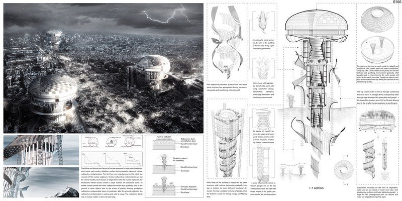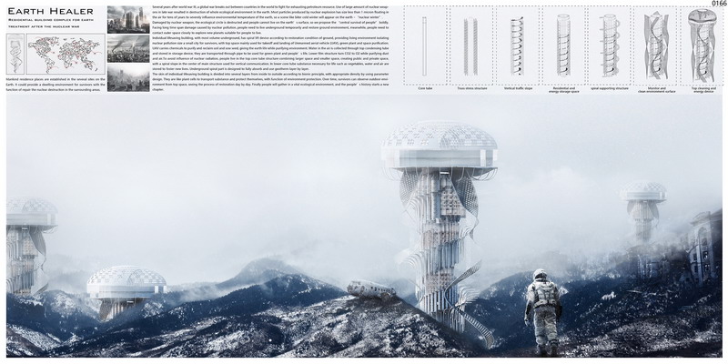 获奖作品《Earth Healer》是为战争后期使用大量核武器遭到破坏的地球生态环境而设计的 “人类的中心生存站”。地球在面对核污染造成的长时间跨度破坏, 人们需要暂时居住在地下以恢复地面环境。根据地面恢复条件, 设计出为幸存者提供生活环境隔离核污染的“人类中心生存站”,如同植物细胞输送物质和保护自己, 具有环保功能。随着时间的推移, 人们最终将聚集在一个重要的生态环境中。作品以其新颖的设计理念、大胆的设计创意和对于建筑未来的美好畅想获得了评委团的青睐,也在国际舞台再次展现了402cc永利官网学子的风采。