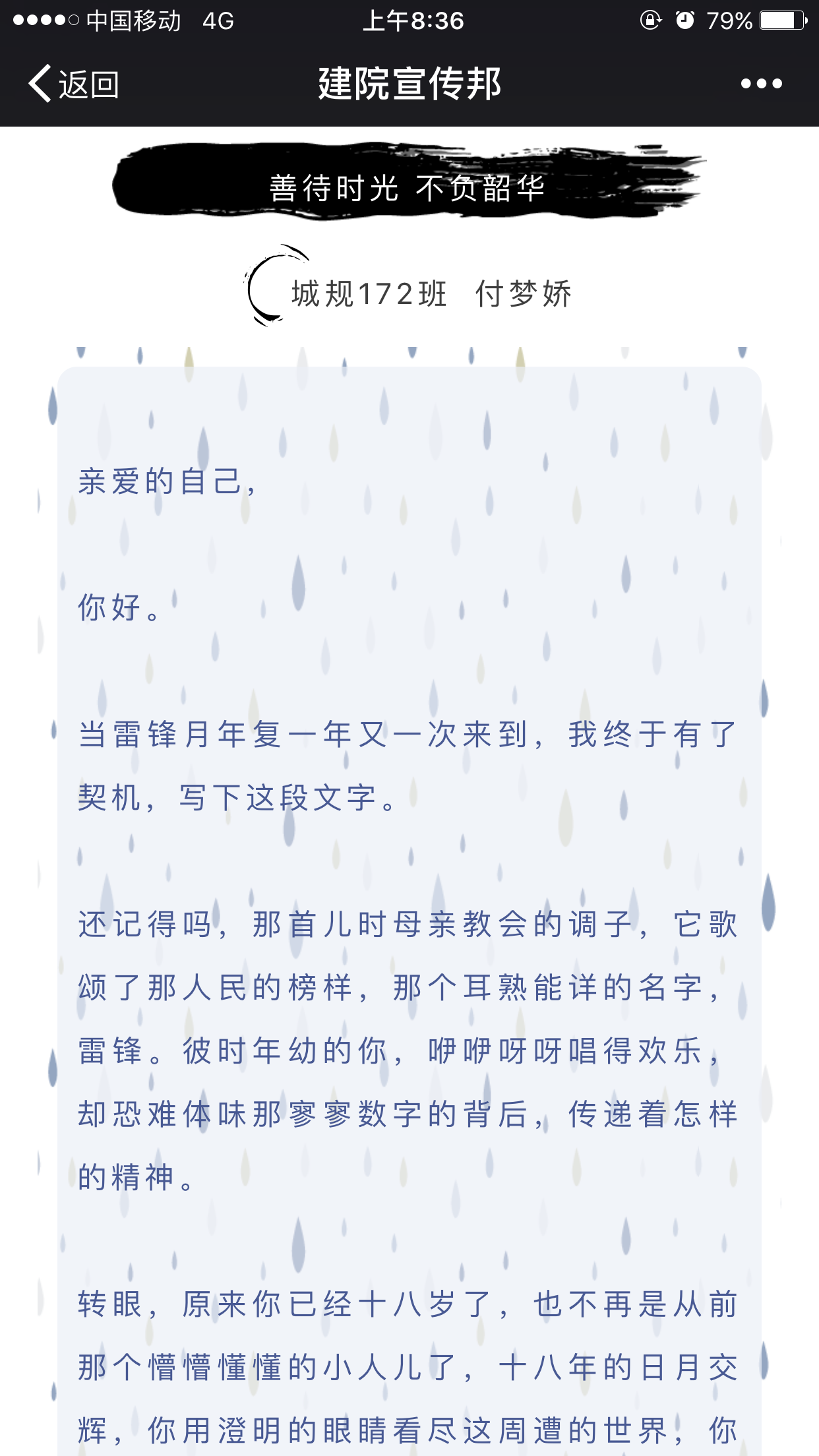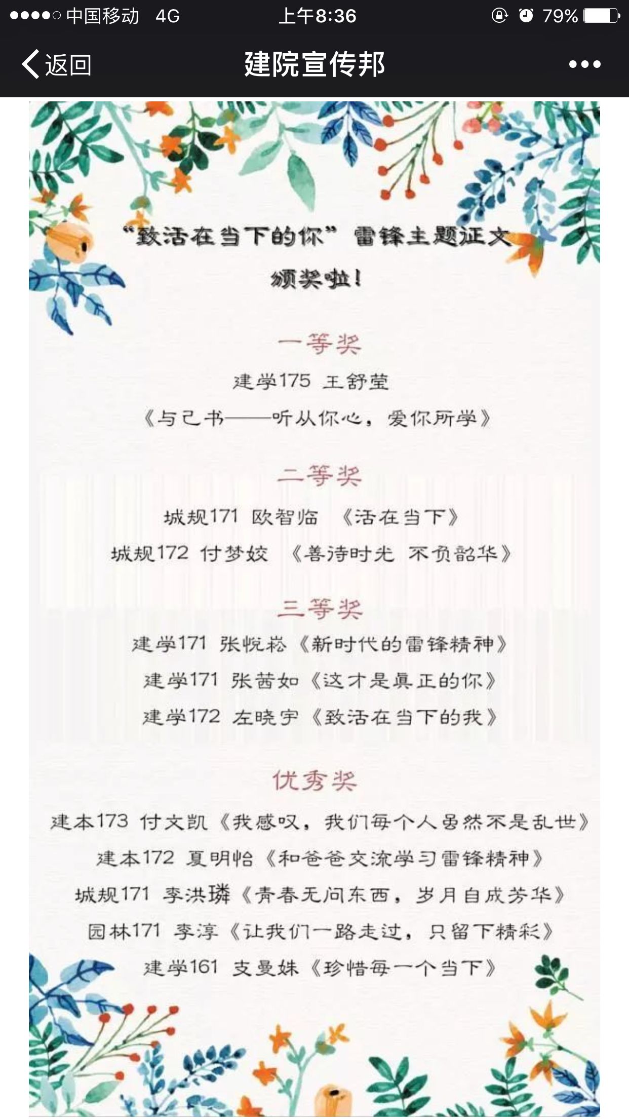 本次活动通过雷锋精神引导同学们珍惜今天,珍惜现在,不驰于空想,不骛于虚声,快乐活在当下。学院的同学们积极响应本次活动,优秀文章层出不穷,将比赛推向高潮。最终,建学175班的王舒莹同学的《与己书——听从你心,爱你所学》以优秀的写作手法和深刻的作品内涵夺得一等奖,在她的文章中“感叹岁月易逝,那么岁月流转成诗的美丽你注定会错过,或许终会有遗憾,或许总是有不完美。我不想你过分关注时间甚至'斤斤计较',更不想你太过执拗于探寻时间所值,而忘记了身在其中感受其流逝的那份无法言说的美好。去享受生活吧,去感受去记住,不必多么荣耀多么完美,做你自己不负心安,就已是岁月静好”一段,道出了深刻的生活哲理,令人深思。