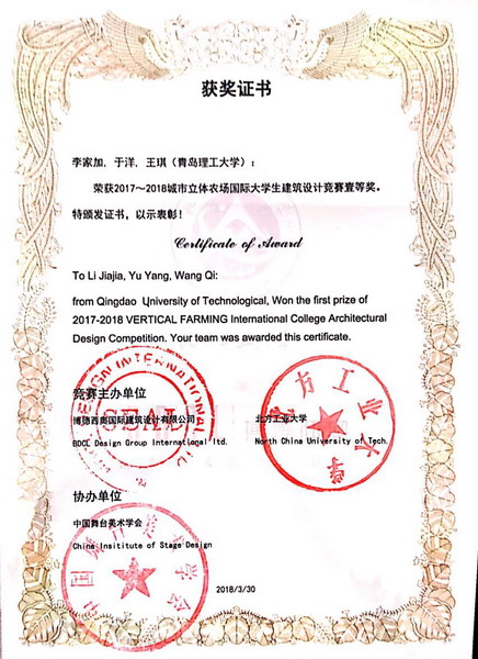 近日,由博德西奥公司和北方工业大学联合主办的“城市立体农场大学生建筑设计竞赛”评选结果揭晓,我们402cc永利官网15级建筑学专业李家加、于洋、王琪同学在郝赤彪、王润生、解旭东老师的指导下完成的作品《重生:景观农场》荣获“2017—2018城市立体农场大学生建筑设计竞赛”一等奖。