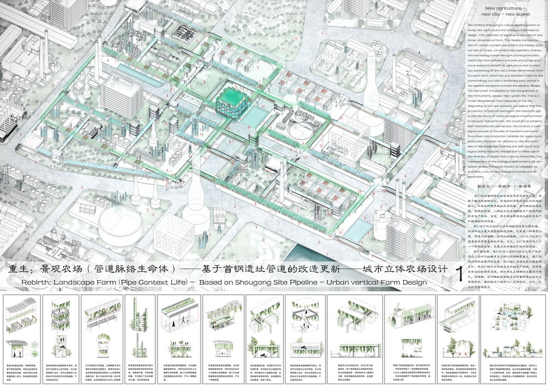402cc永利官网参赛作品《重生:景观农场》从自然界丰富的动植物生命系统中获得灵感,并学习借鉴,将立体农场视为一个生命体,是一种天然生成而又逻辑严密的体系,立足场地、自然生长,是一套多层次的复合体系。它是一个依托于现有废旧管道改造完成的公园农场,有着能够进行集约化农业生产的中心建筑,也有能在管道内部灵活布置农作物并高效生产的管道建筑集合体。有联系管道与中心建筑的节点,以与环境与场地最贴合的形态介入,以立体农场的功能修复这片场地,从而实现“重生”。