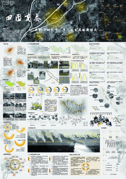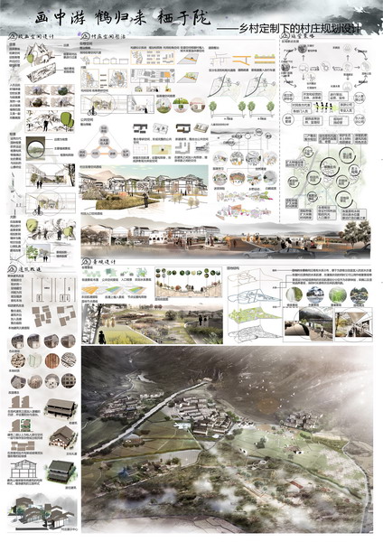 建筑学院报送的作品《画中游·鹤归来·栖于陇》和《田园变奏》,针对当前乡村地域狭小,管理不善等问题进行整改和规划,目的使乡村带动城市,凸显乡村语境下不可忽视的人文底蕴。团队合作调查了现代乡村的发展情况,基地的具体地理和空间条件并组织进行了调查问卷。在内容上,作品包含了对区位、资源等要素的整合分析和对基地的深入解读,介绍了规划的缘由,考虑到了村庄产业的总体发展战略,旅游路线规划设计,以及后续的空间设计、整治、改造和运营策略,充分体现了规划的完整性和可行性。最终从包括清华大学、同济大学、天津大学、重庆大学等在内的48所高校62份方案中脱颖而出,获得一等奖1项、优胜奖1项。