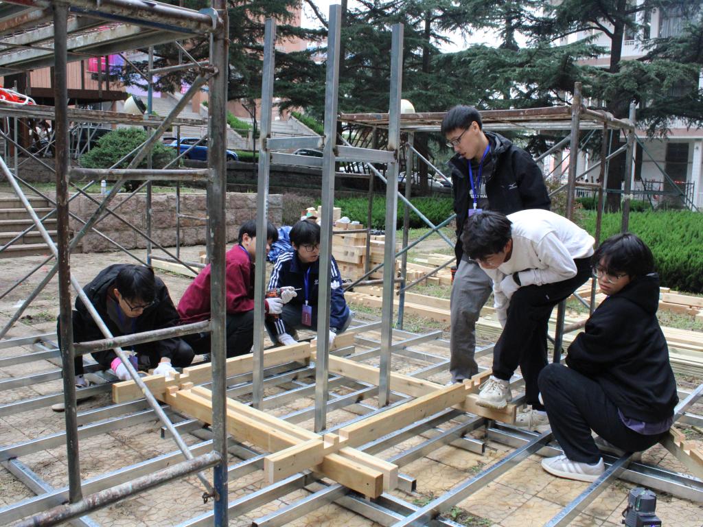 大赛前期,学院师生及工作人员提前进场,搬运木材、布置场地、搭建脚手架,技术人员也陆续就位,进行设备调试与安全排查,为后续的学生搭建环节打下坚实基础。预搭建现场,来自402永利集团、山东建筑大学、烟台大学、山东大学等17所高校的5支联合参赛团队陆续报到,进入场地后开始准备前期工作。各队学生在教师指导下熟悉环境、核对材料、校验节点,有条不紊地开展初步组装,现场气氛十分热烈。同学们在协作中凝聚共识,在交流中激发灵感,展现出严谨的专业态度与良好的团队精神。
