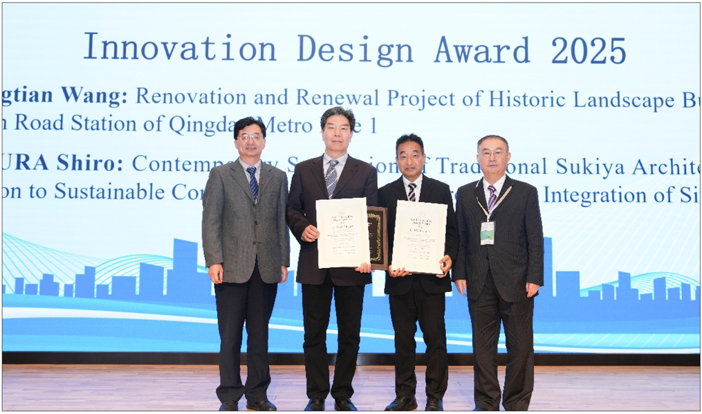 在本届大会的设计奖项评选中,402cc永利官网名誉院长王兴田教授,凭借主持完成的 “青岛地铁1号线中山路站历史景观建筑更新改造项目”,荣获 “亚洲城市环境学会2025年度创新设计奖(Innovation Design Award 2025)”。王兴田教授长期致力于城市历史街区保护与建筑更新领域的研究与实践,强调“在传承中创新、在更新中延续”的设计哲学,为推动中国城市更新理论和实践发展作出突出贡献。该项目以“传承与再生”为核心理念,融合历史建筑保护与现代交通设施建设,在尊重历史文脉的基础上,注入绿色建造、生态景观与公共艺术元素,实现了城市遗产保护与现代功能更新的有机融合,成为青岛城市更新与文化传承的典范。