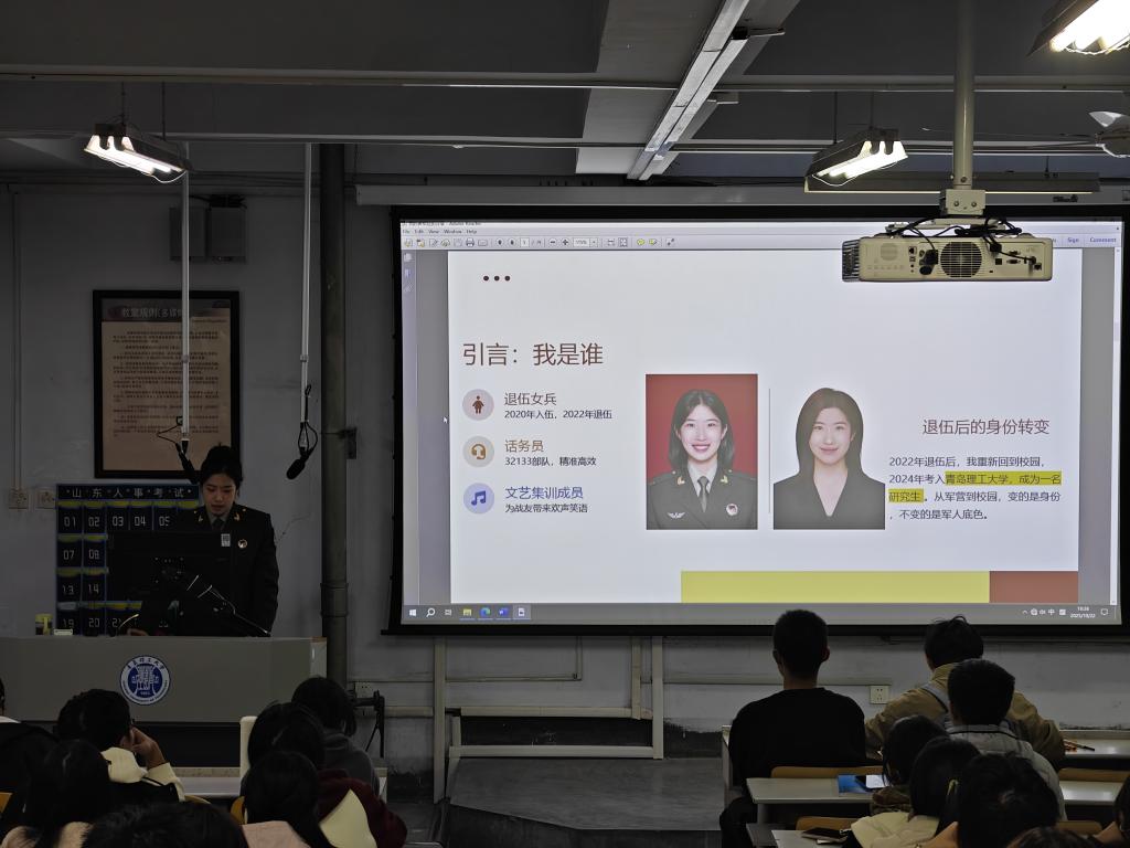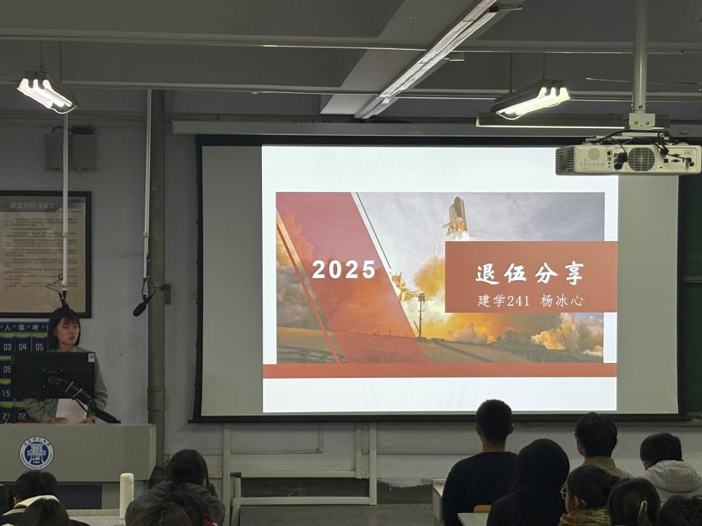 讲座现场,建研2404班蔺耿惠以《把青春奉献给祖国的两年》为题,深情讲述了自己参军的初心与挑战。她回忆道,新兵连的三个月是她人生中最纯粹、最艰苦也最难忘的时光,磨砺出了坚韧不拔的品格。作为话务员,她坚守平凡却责任重大的岗位,在实战演习中用忠诚与使命践行军人本色。在分享中她细腻描绘了在军营点滴中成长的心路历程,从初入军营的迷茫到逐渐适应,再到岗位上的历练与蜕变,每一个细节都见证了她的成长。她坦言,部队锤炼出的自律与坚韧,回归校园后化作直面学术难题的底气,激励她在科研探索中迎难而上,不断突破自我。军旅经历不仅赋予她强健的体魄,更塑造了无畏困难、勇于担当的精神,成为她人生路上宝贵的财富,指引她在学习与生活中坚定前行。