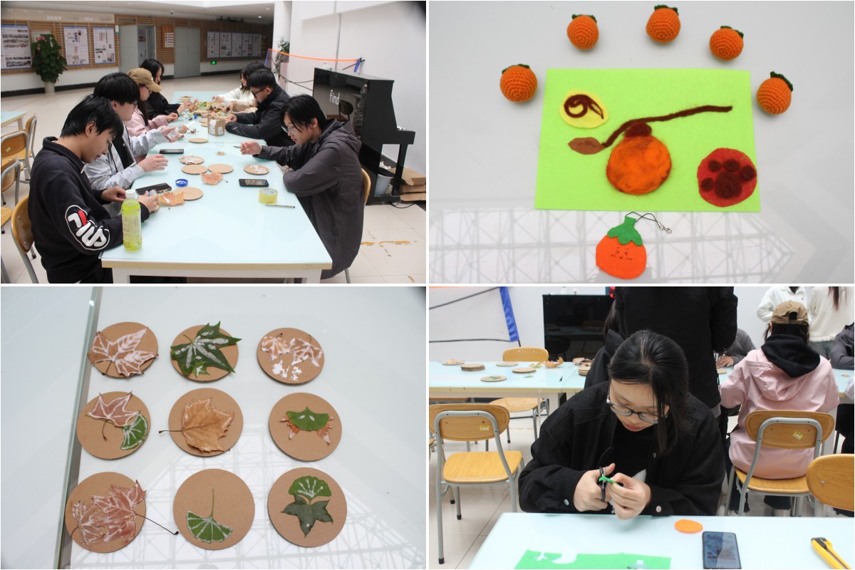 在小柿子羊毛毡制作环节,现场气氛热烈,通过对羊毛塑形时的揉捏、柿蒂制作时的固定、纹理点缀时的戳刺等步骤,完成了一幅幅形态圆润、细节鲜活的羊毛毡小柿子作品,同时同学们还灵活的将作品加工为钥匙扣、书签等实用物件,赠予师长与友人,以手作传递真挚情感,让传统节气里的美好寓意通过亲手创作得以传递。
