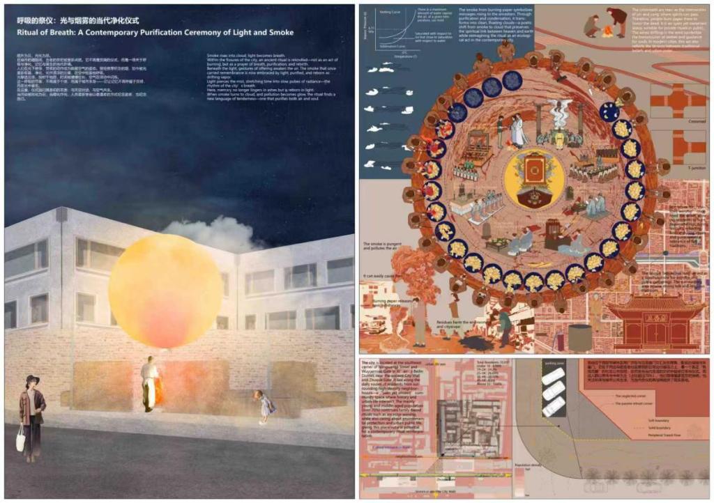 由我们402cc永利官网朱思颖、张浚烽同学设计,沈祺老师指导的作品《呼吸的祭仪:光与烟雾的当代净化仪式》,作品聚焦西安老城区街角闲置空间,以“转化”为核心策略,将传统焚纸行为从污染性活动升华为一套融合生态净化、公共参与精神延续的“轻介入”装置。该作品不仅精准回应当下城市微更新与生态可持续的现实议题,更在方法论层面巧妙融汇了传统祭祀文化与当代技术理念,展现出卓越的跨学科创新设计能力,收到评审专家的一致赞许,作品最终入围前四强,获得二等奖。
