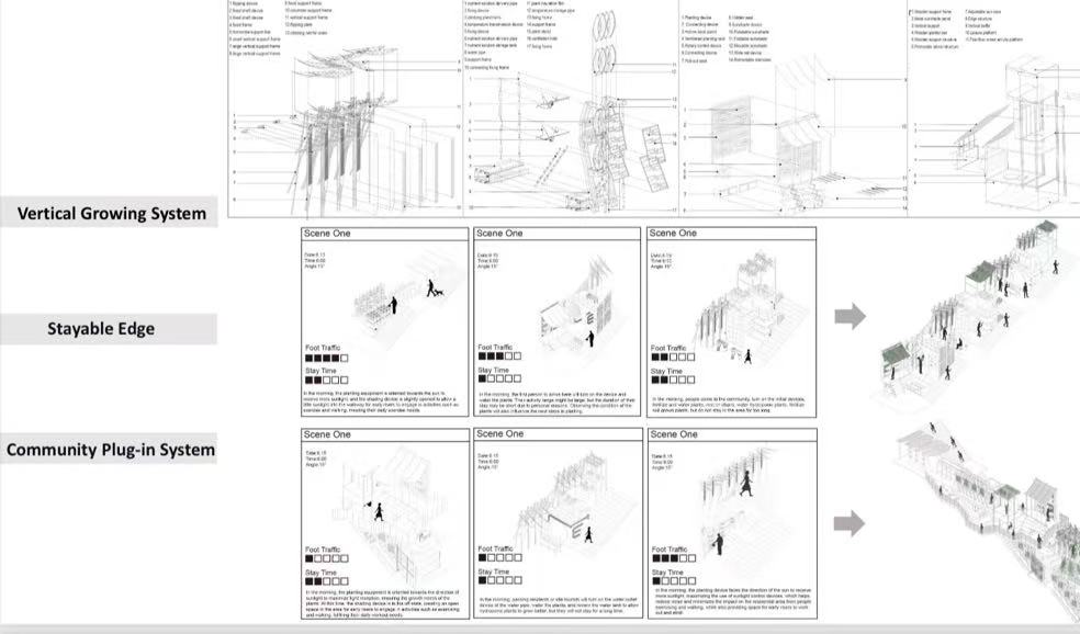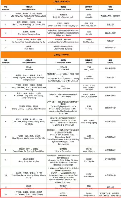 由我们与韩国建国大学、武汉工程大学、西南交通大学联合设计作品《拾阶而上》(设计者:于远昊、张奕婷、张梦玮、马楚涵,指导教师:张珺琢),其着眼于城市中被忽视的楼梯旁边角空间,通过合理的改造与精准的功能植入,意图将社会中与环境脱节、利用率低下的消极区域,转变为兼具实用价值与人文关怀的社区活力点,项目以服务于周边多样化的使用人群为出发点,收到专家们的一致认可,最终获得三等奖。两项获奖作品充分体现了我们建筑学学子对社会空间的深刻思考与研究,以富有创见的建筑学语言,对当代城市问题作出了卓有成效的回应。