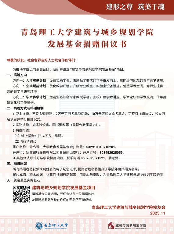 我们致力于将学院建设成为国内一流、国际知名的建筑领域与城乡规划人才培养高地和创新策源地。您的捐赠,不仅是对教育事业的慷慨善举,更是投资于未来人居环境塑造者的远见卓识。